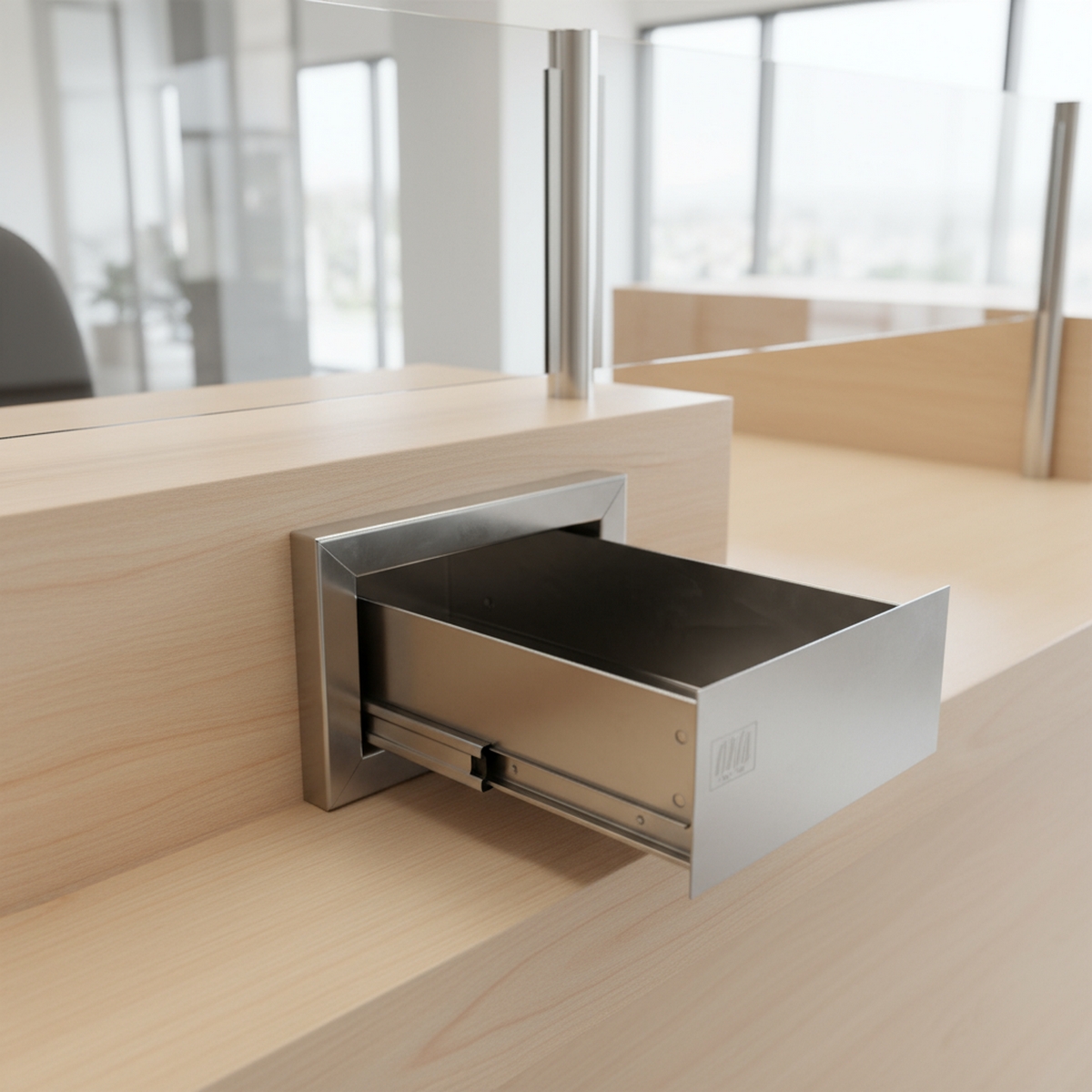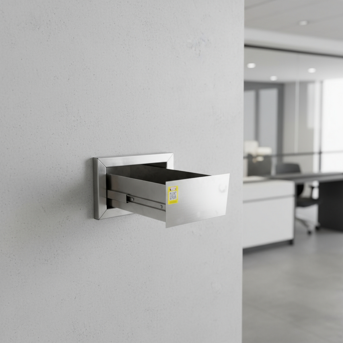 Cajón pasa valores/bultos con tratamiento en esmalte sintético y frente de acero inoxidable. Medidas internas: 280 × 180 × 500 mm. Medidas externas: 320 × 220 × 500 mm. Se entrega listo para instalar en mampostería, durlock y estructuras de hierro.